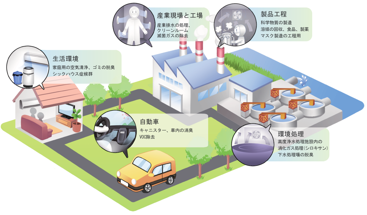 | 30 - 60 mesh | ヤシ | 低濃度区間の脱臭性能に優れ、VOC対策 | 自動車フィルター、空気浄化 | ||